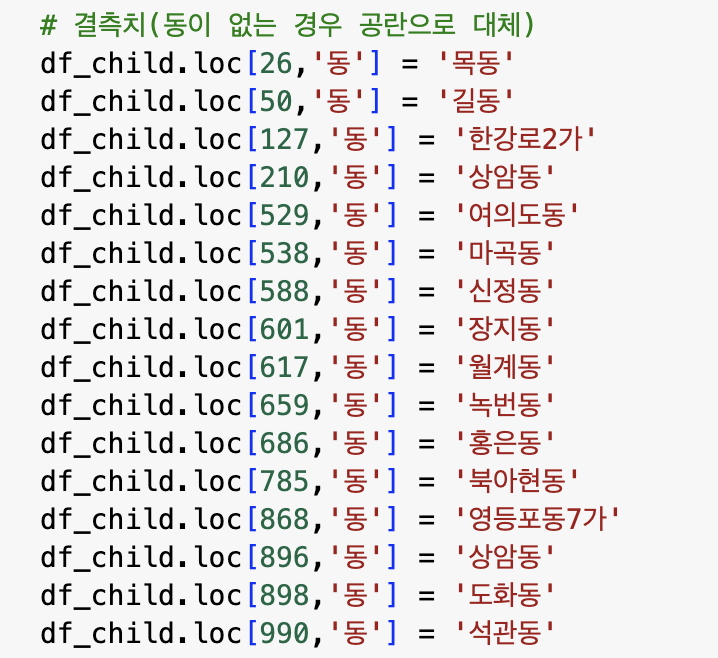 법정동을 기준으로 요소들의 갯수를 계산해야 하기에 도로명이나 좌표로 되어있는 데이터들을 수정할 필요가 있었다.