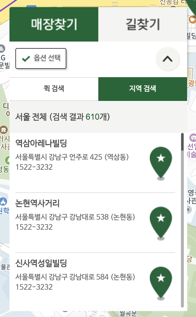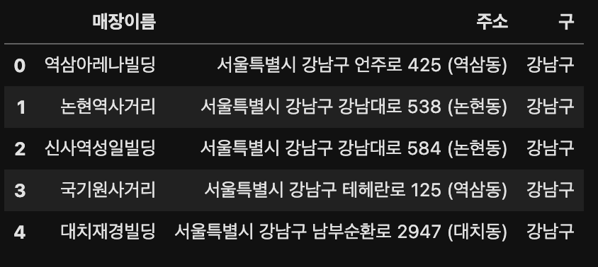 수집은 스타벅스 홈페이지를 기준으로 서울 전체 매장을 검색하여 600여개의 스타벅스 매장의 주소지를 크롤링하였다.