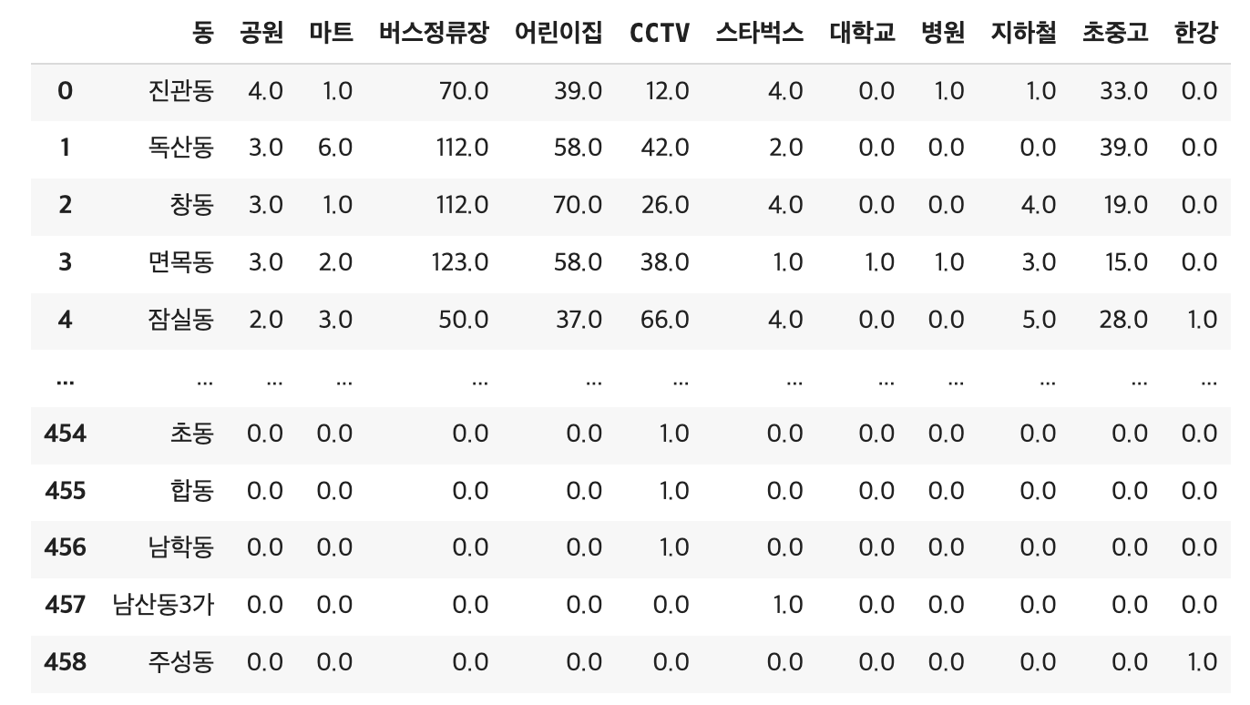 최종적으로 우리가 선정한 종속변수를 동별로 정리할 수 있었다...