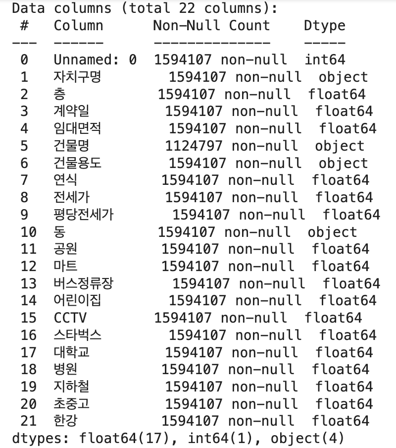 건물명은 브랜드아파트들을 구분하기 위해 살리고 싶었으나 데이터 결측치가 많은 관계로 drop 시켰다. (아쉬운 부분..)