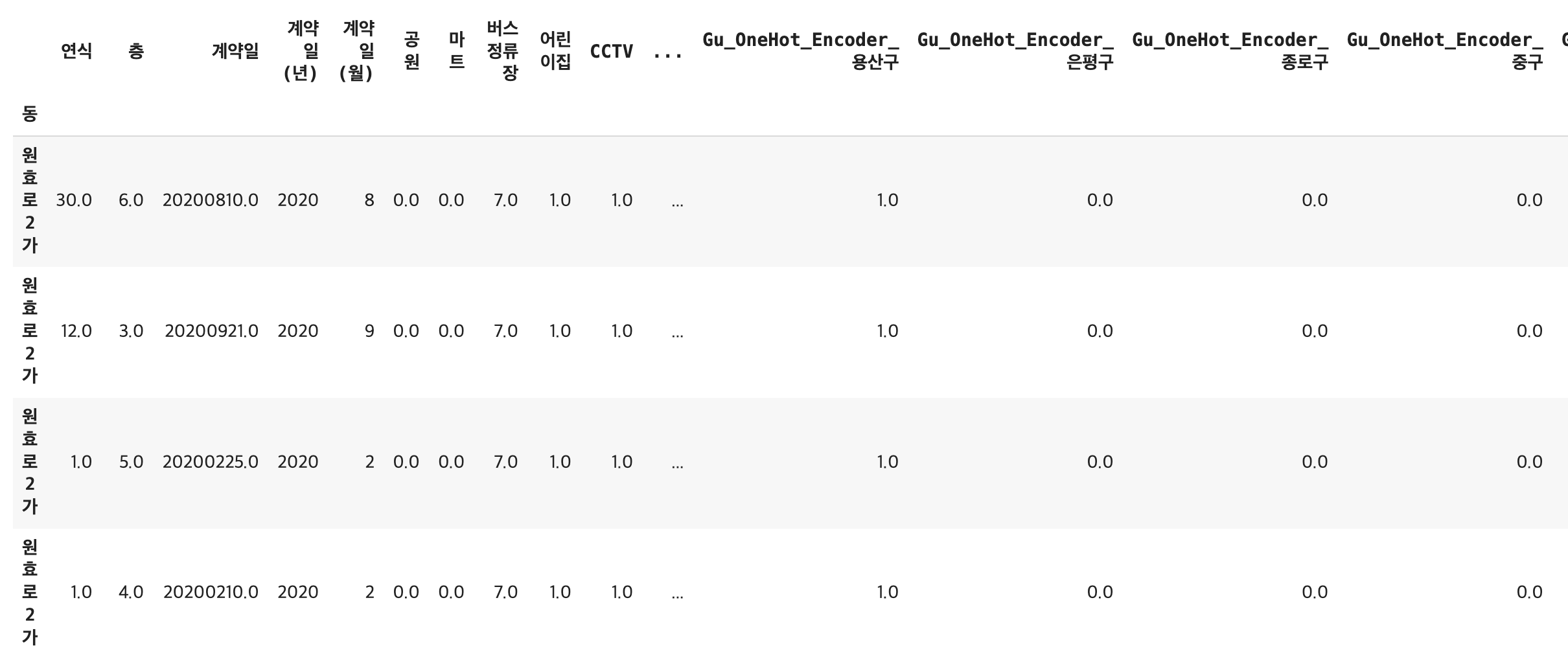 현프로젝트의 경우 건물명, 건물용도는 순서, 랭크가 없으며, 카테고리가 많은 편은 아니기에 onehot 인코딩을 시켜주었다.