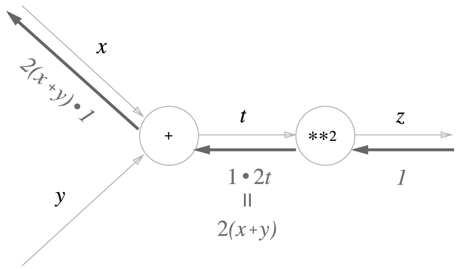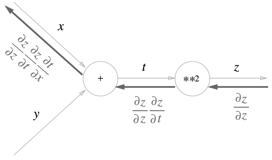 이처럼 중간까지 구한 미분 결과를 공유할 수 있어 다수의 미분을 효율적으로 계산할 수 있다.