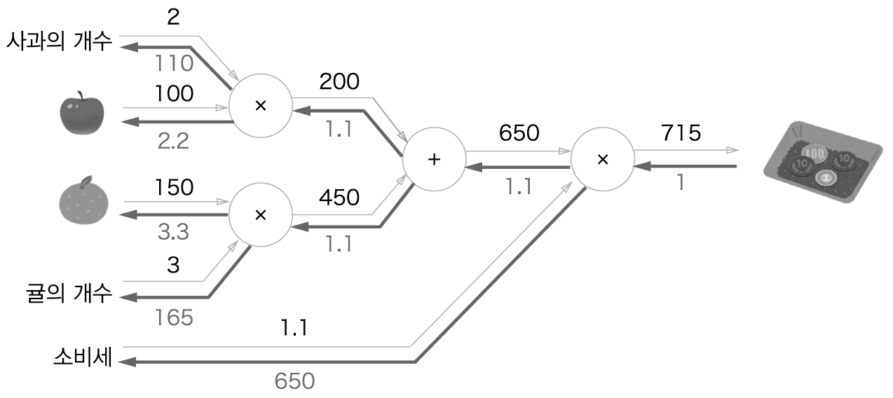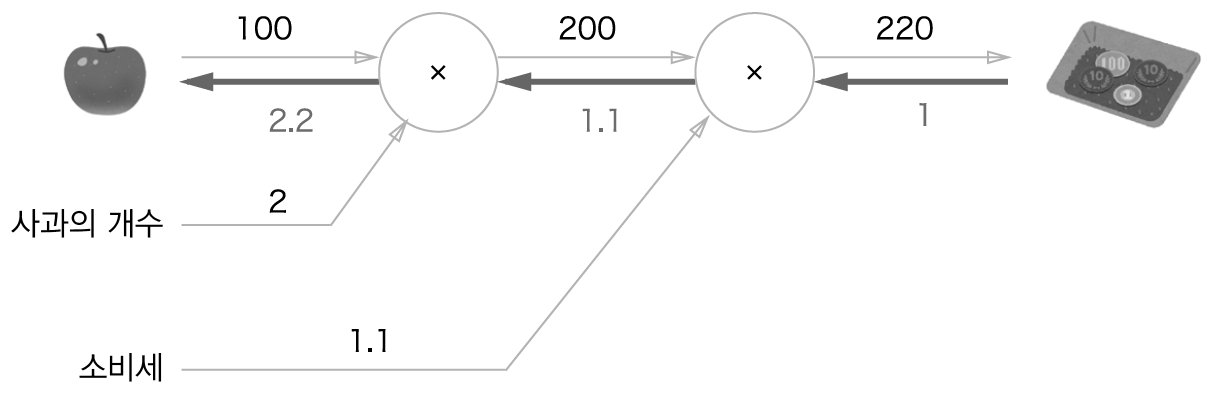 미분값 2.2는 사과 가격에 대한 지불 금액의 미분값으로 사과가 1원 오르면 최종 금액은 2.2원이 오른다는 뜻이다.