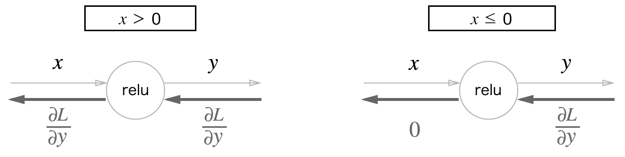 순전파의 입력 x가 0보다 크면 역전파는 상류의 값을 그대로 하류로 흘린다.