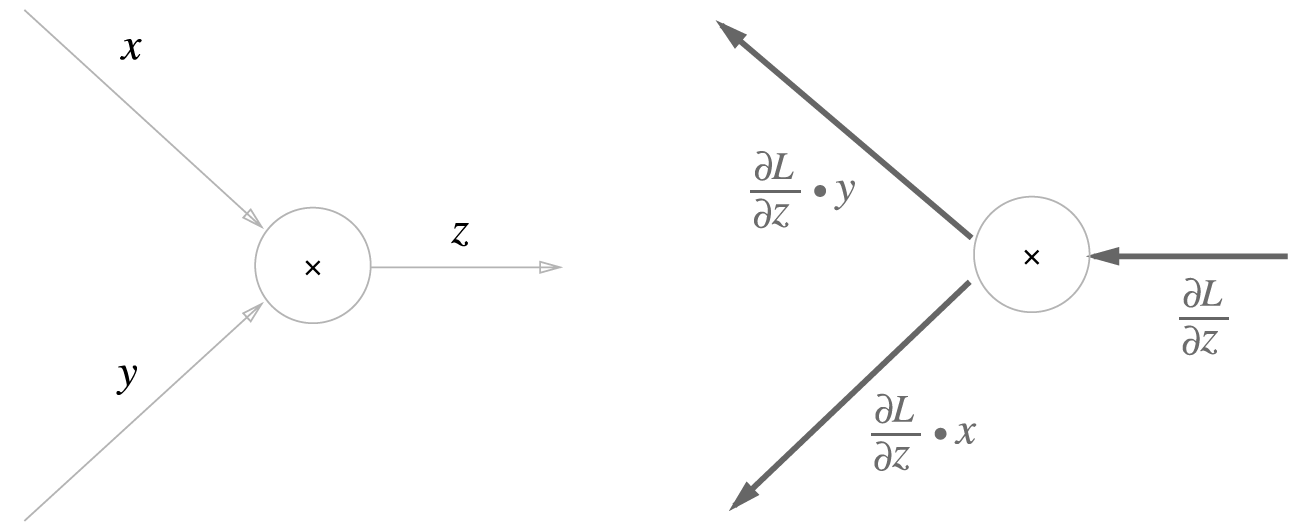 4단계 : 'x'노드는 순전파 때의 값을 서로 바꿔 곱한다.