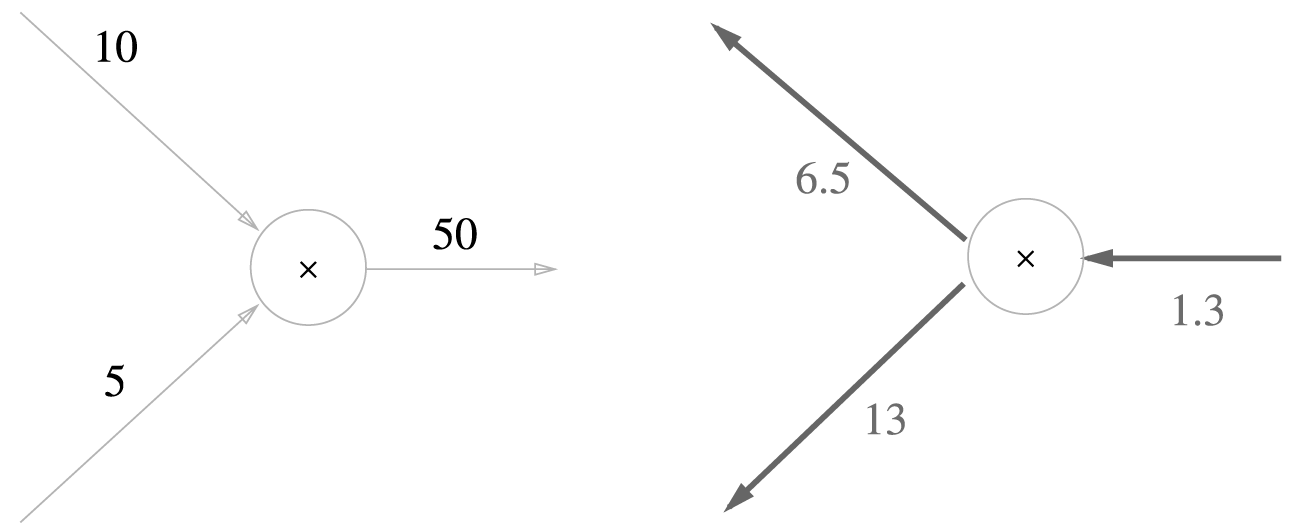 즉 덧셈 노드의 역전파는 1을 곱하기만 할 뿐이므로 입력된 값을 그대로 다음 노드로 보내게 된다.