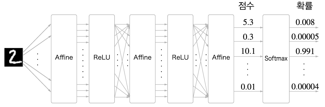 그림 5-28과 같이 숫자 '0'의 점수는 5.3에서 softmax 계층을 통과해 0.008(0.8%)가 되며, '2'의 점수는 10.1에서 0.991(99.1%)가 된다.