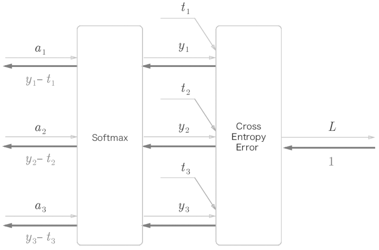 Cross Entropy Error계층은 y1, y2, y3와 정답 레이블 t1, t2, t3를 받아 이로부터 손실 L을 출력한다.