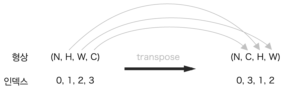 이처럼 데이터는 4차원 형상을 가진 채 각 계층을 타고 흐르는데 신경망에 4차원 데이터가 하나 흐를 때마다 데이터 N개에 대한 합성곱 연산이 이뤄진다. 즉, N회분의 처리를 한 번에 수행한다.