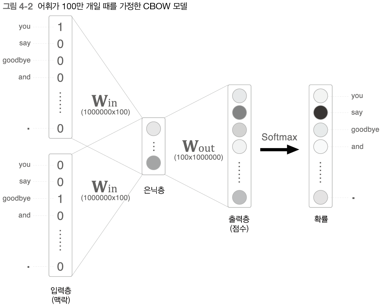 그림 4-2와 같이 어휘가 100만개, 은닉층의 뉴런이 100개인 CBOW 모델을 생각해보자.