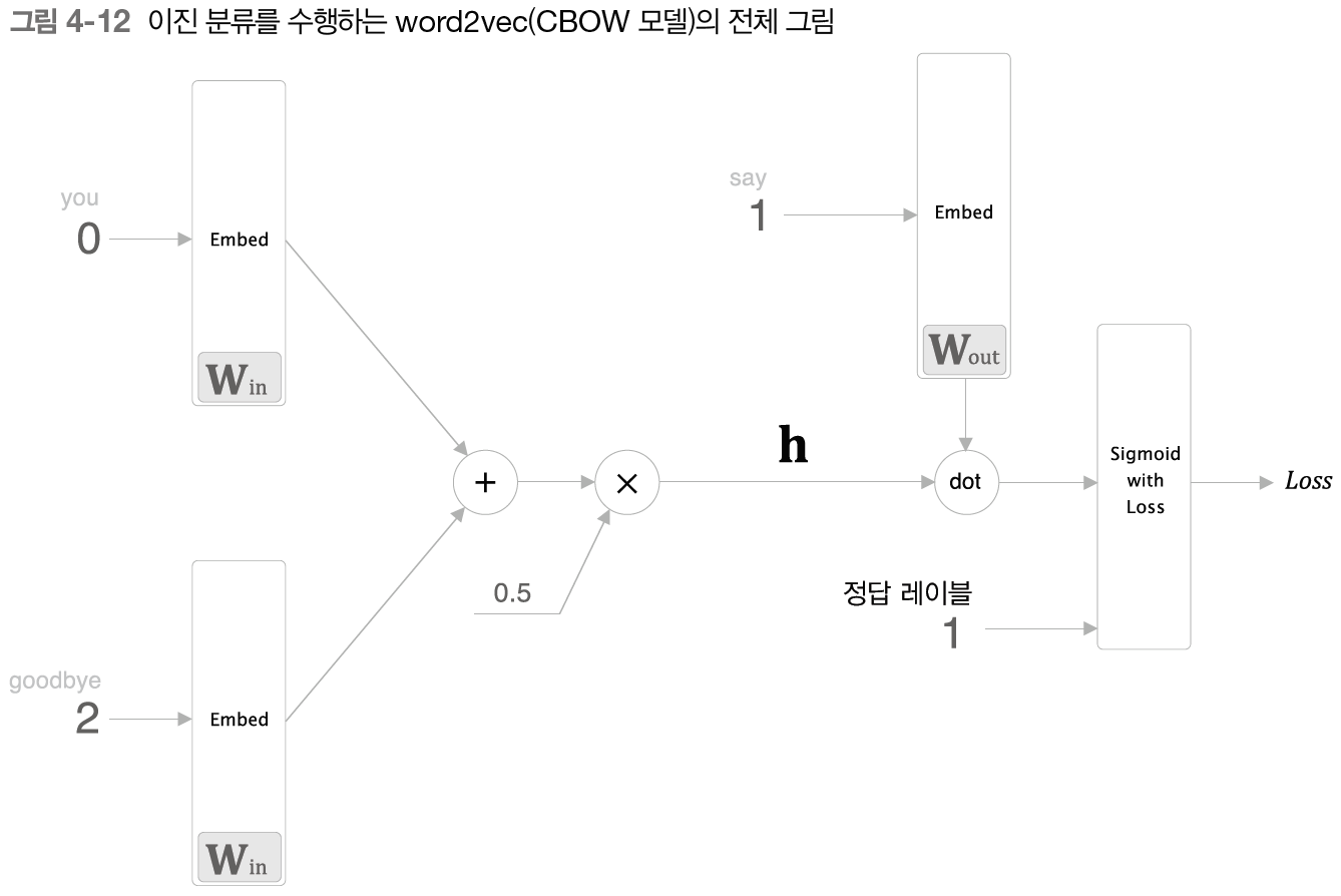 - 네거티브 샘플링은 부정적 예를 몇 개 샘플링하는 기법으로, 이를 이용하면 다중 분류를 이진 분류처럼 취급할 수 있다.