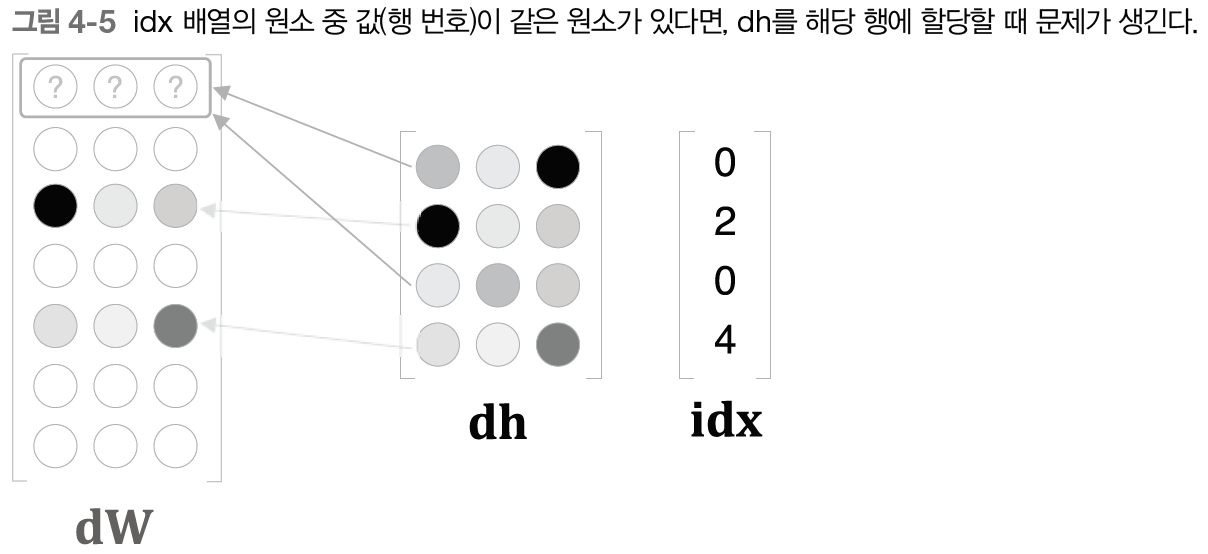 - 입력층의 원핫 표현과 가중치 행렬(Win)의 곱 계산 -> Embedding 계층 도입으로 해결