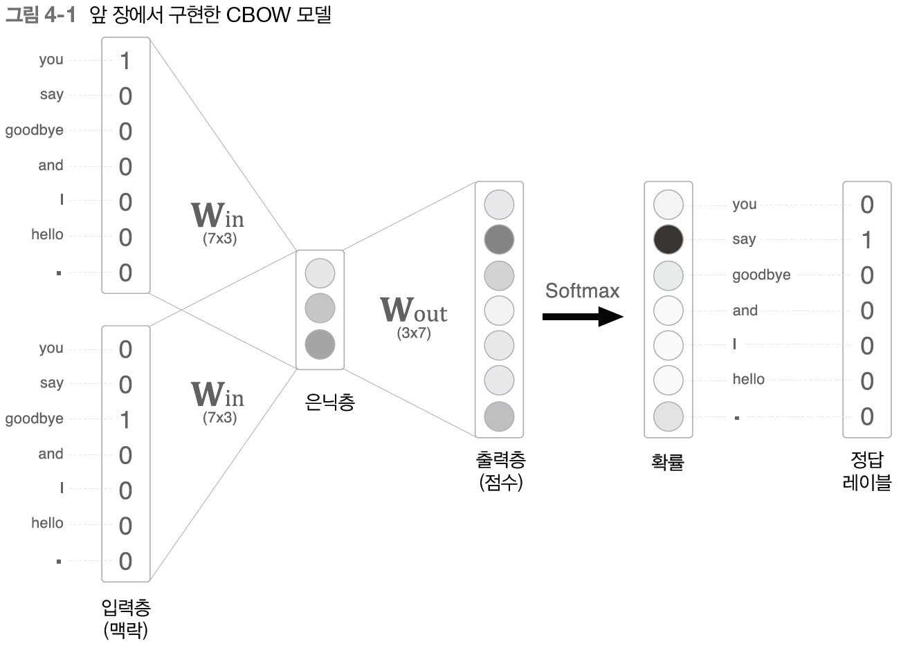 이 점수에 소프트맥스 함수를 적용해 각 단어의 출현 확률을 얻고 이 확률을 정답 레이블과 비교하여(교차 엔트로피 오차를 적용하여) 손실을 구한다.