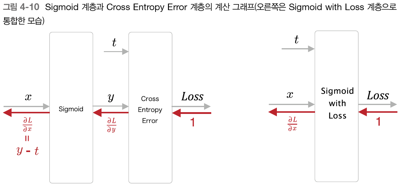 역전파의 y-t는 이 두값의 차이로 정답 레이블 t이 1이라면 y가 1(100%)에 가까울수록 오차가 줄어든다.