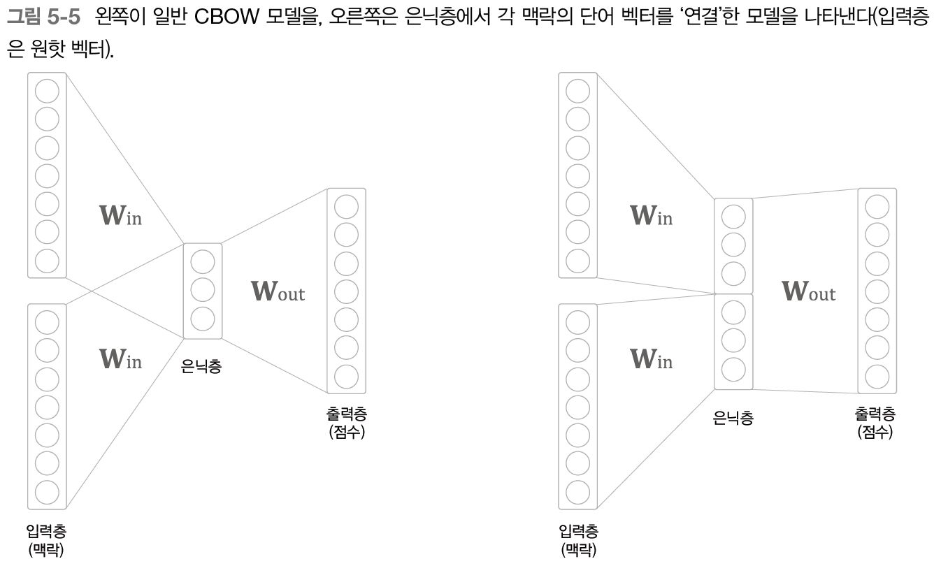 그림 5-5의 오른쪽과 같이 맥락의 단어 벡터를 은닉층에 연결하는 방식을 생각할수도 있지만 가중치 매개변수도 늘어나 좋지 않은 방법이다.
