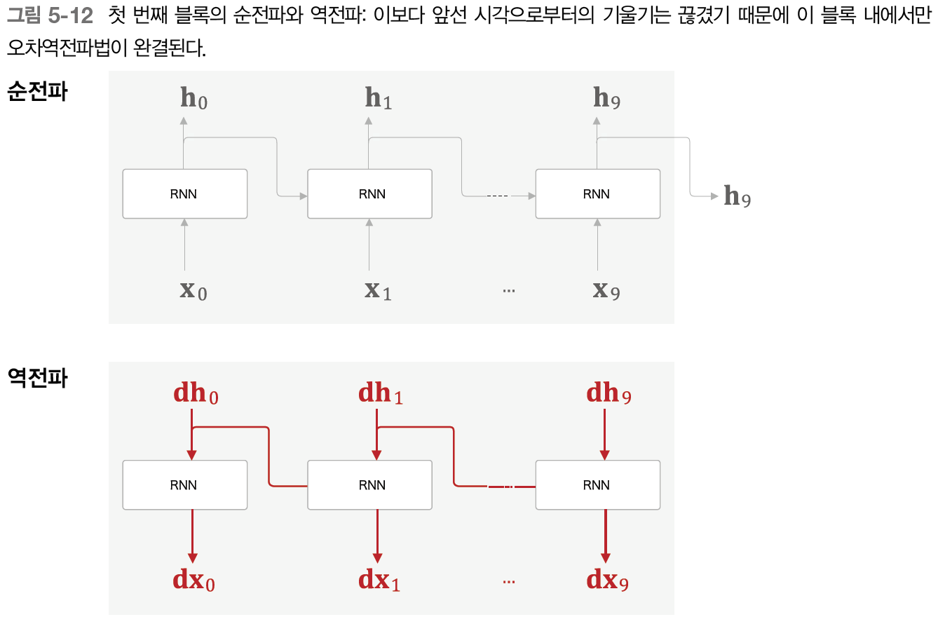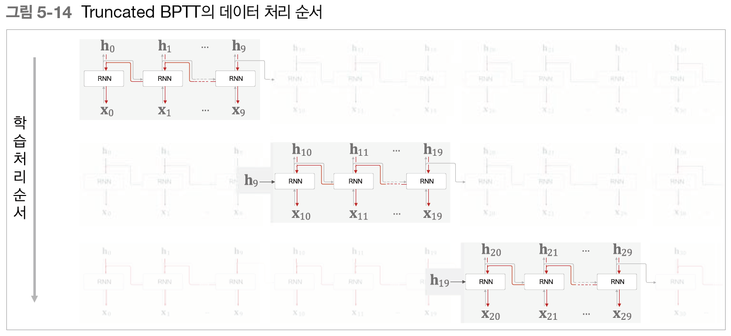- 긴 시계열 데이터를 학습할 때는 데이터를 적당한 길이씩 모으고('블록'), 블록단위로 BPTT에 의한 학습을 수행한다.(=Truncated BPTT)