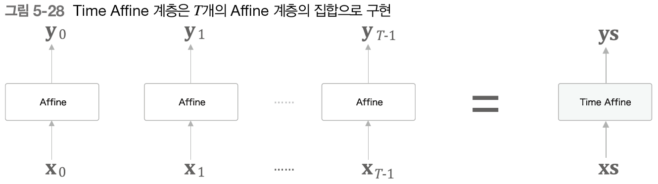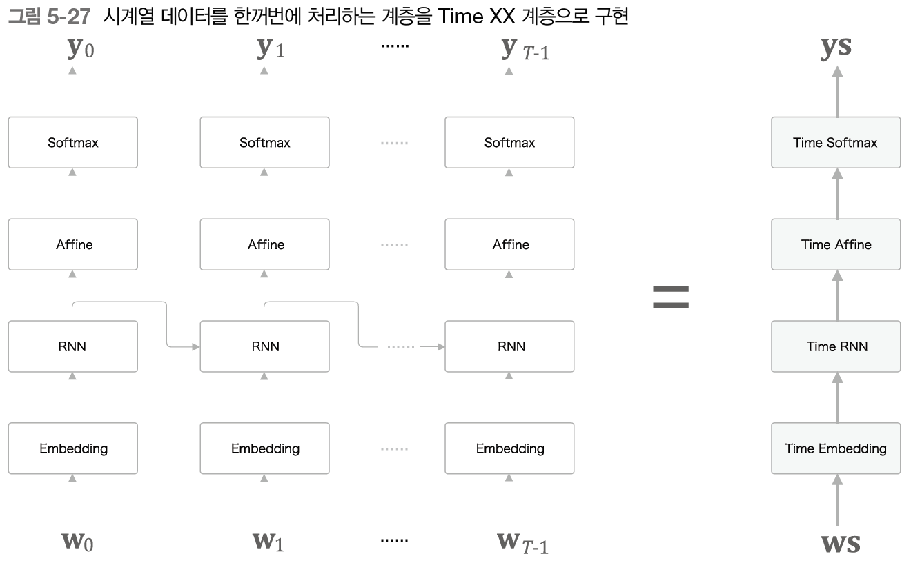 그림 5-27처럼 Time RNN뿐만 아니라 Time Affine, Time Softmax처럼 시계열 데이터를 한꺼번에 처리하는 계층을 구현해보자.
