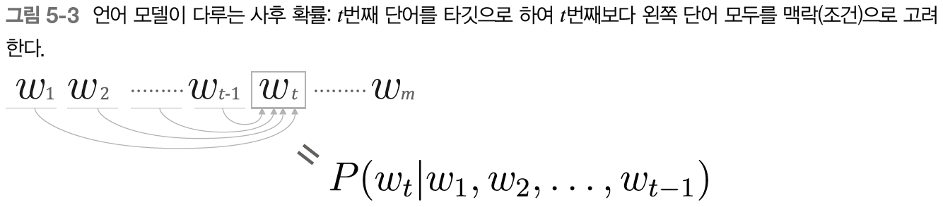 식 5-4를 보면 동시확률 P(w1, ..., wm)은 사후 확률의 총곱으로 타깃 단어보다 왼쪽에 있는 모든 단어를 맥락(조건)으로 했을 때의 확률이다.