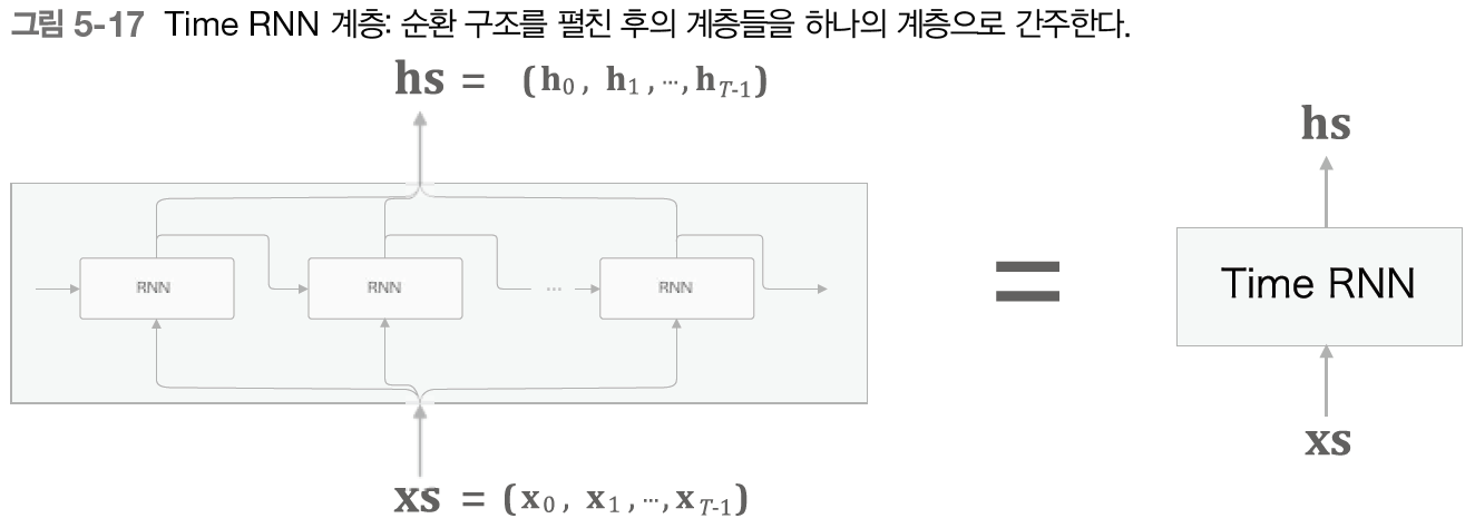 이를 모듈화해보면 그림 5-17처럼 입력xs(x0, ..., xT-1)과 출력hs(h0, ..., hT-1)을 각각 하나로 묶어 T개의 RNN계층을 단일 계층으로 표현할 수 있다. 이를 Time RNN 계층이라고 한다.