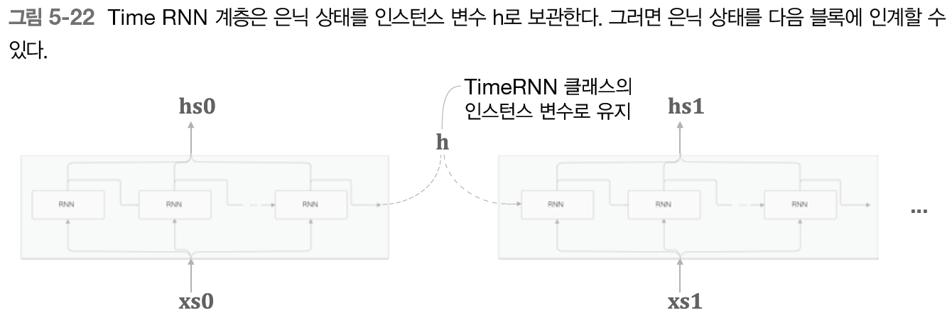 그림 5-22처럼 RNN 계층의 은닉 상태를 Time RNN 계층이 관리하면 사용자가 은닉상태를 '인계하는 작업'을 생각하지 않아도 된다.