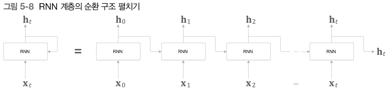 RNN계층의 순환구조를 펼치면 그림 5-8과 같이 나타낼 수 있다.