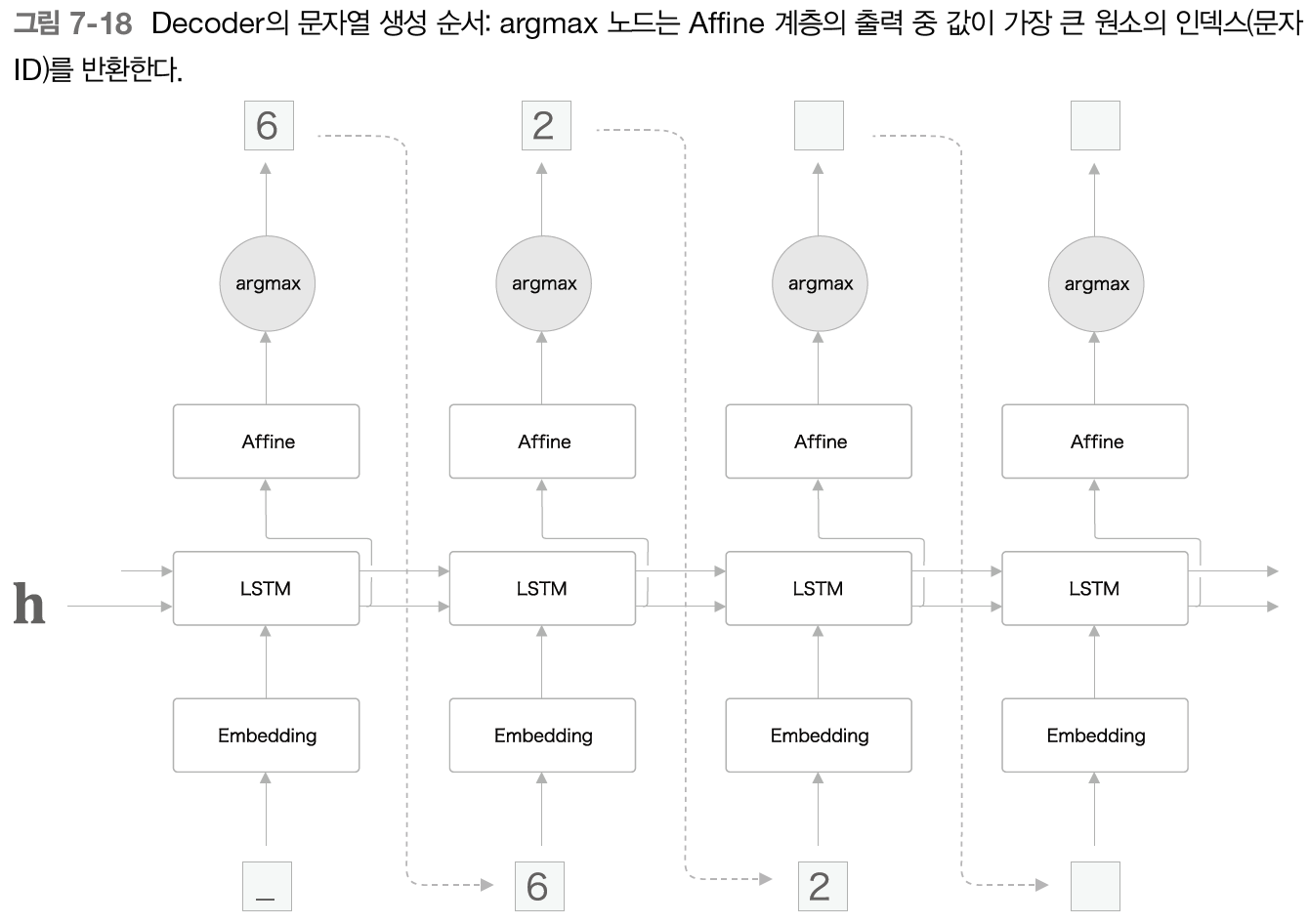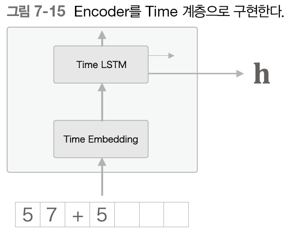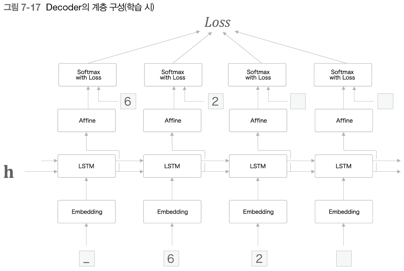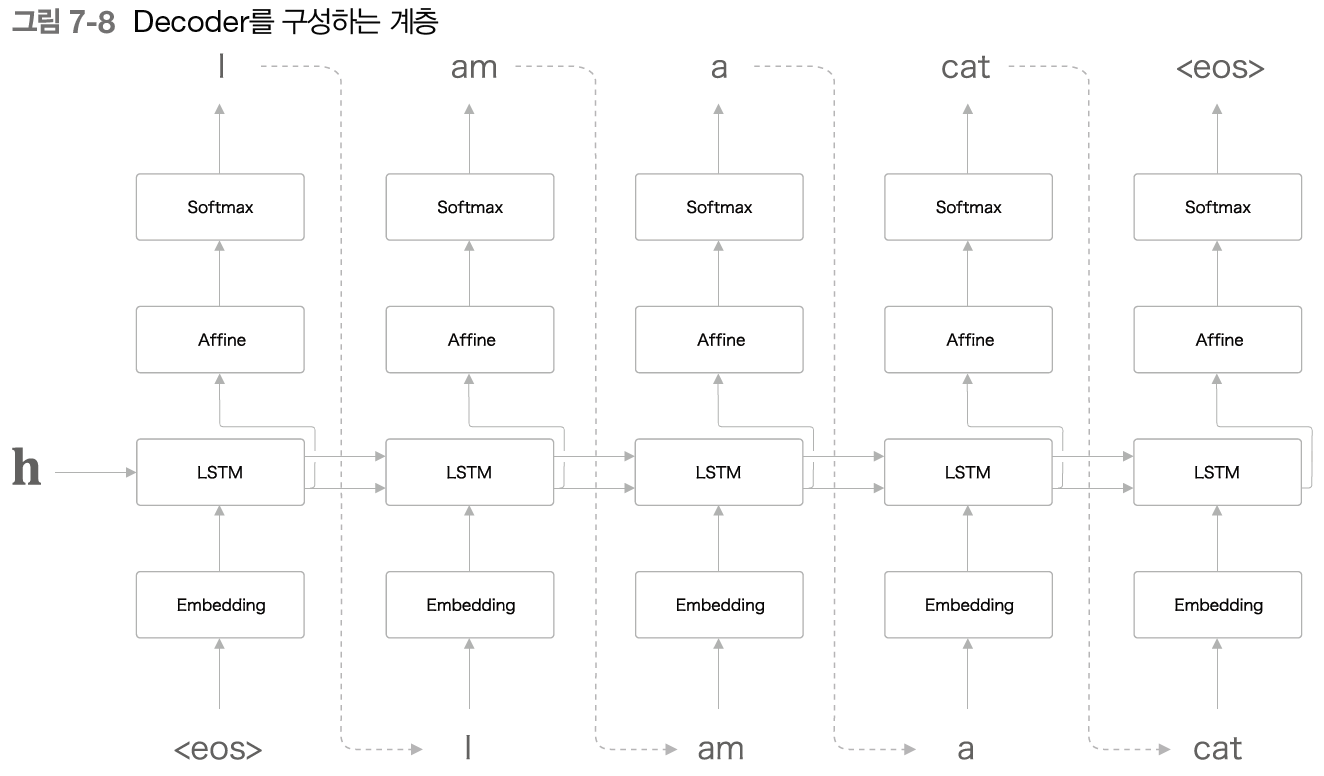 그림 7-14처럼 Encoder에서 LSTM계층의 은닉상태 h를 출력하고 이 은닉상태 h가 Decoder로 전달된다.