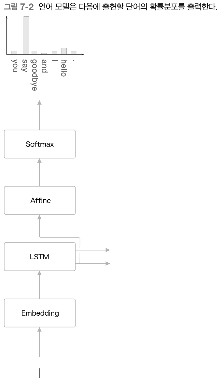 그림 7-1과 같이 LSTM 계층을 이용한 언어 모델이 'you say goodbye and I say hello' 라는 말뭉치를 학습했다고 가정해보자.