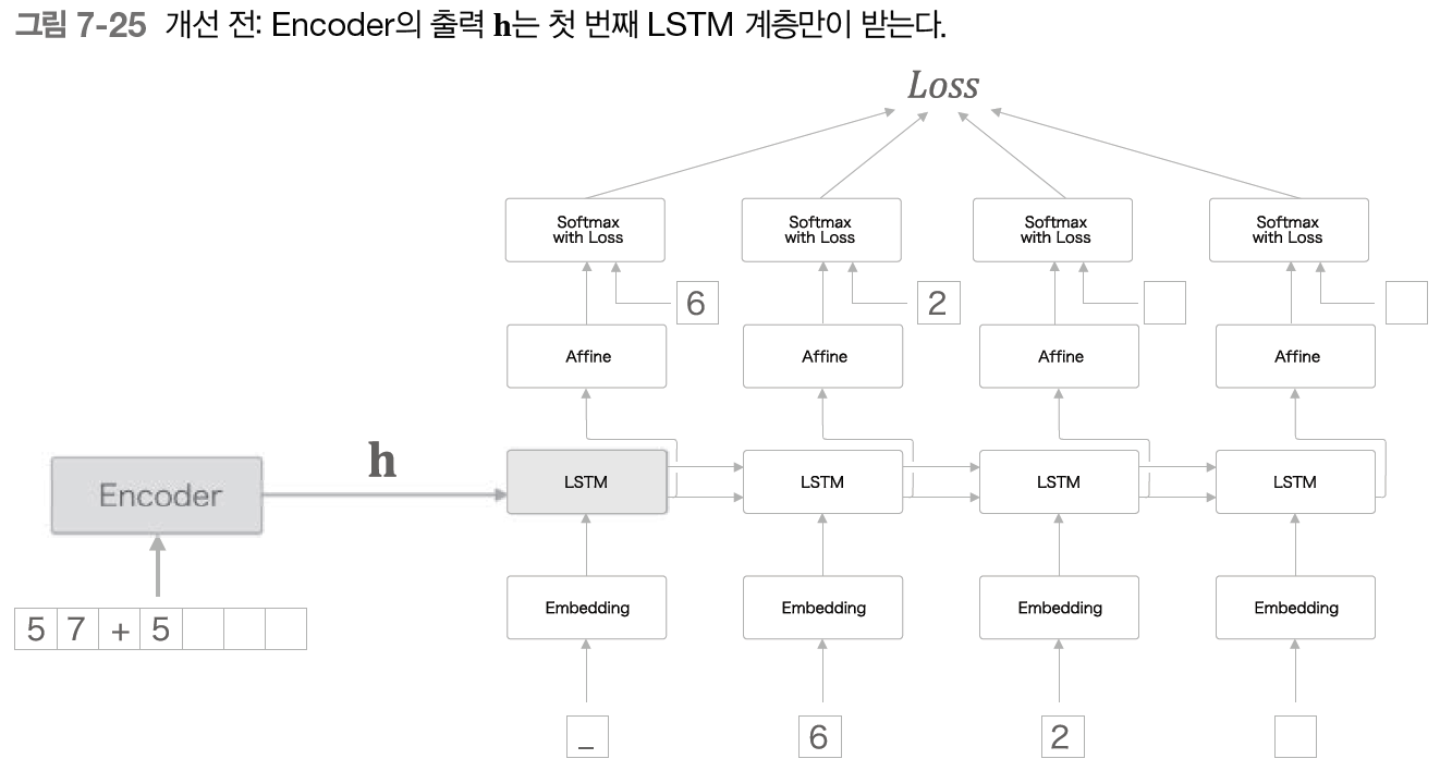 하지만 개선 전에는 최초 시각의 LSTM 계층만이 벡터 h를 이용하고 있다.