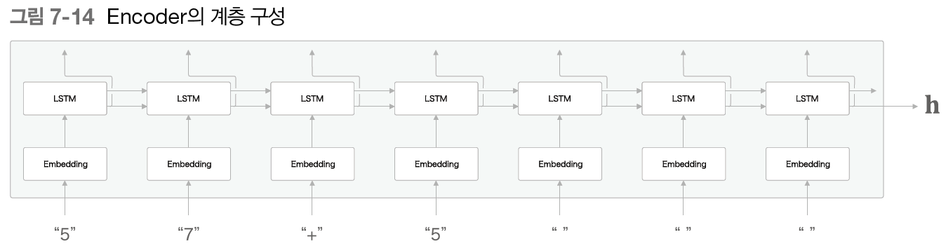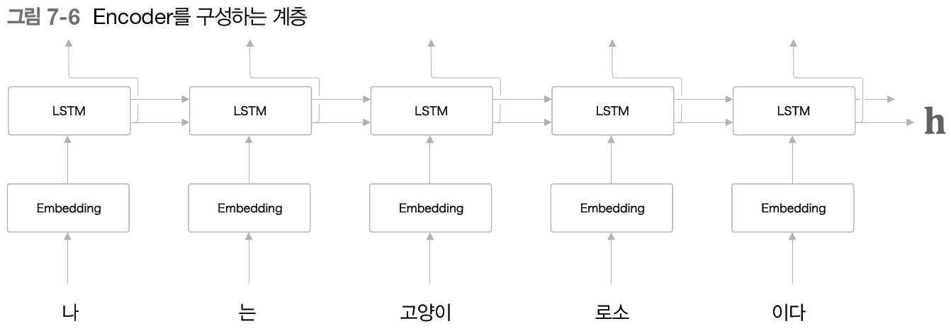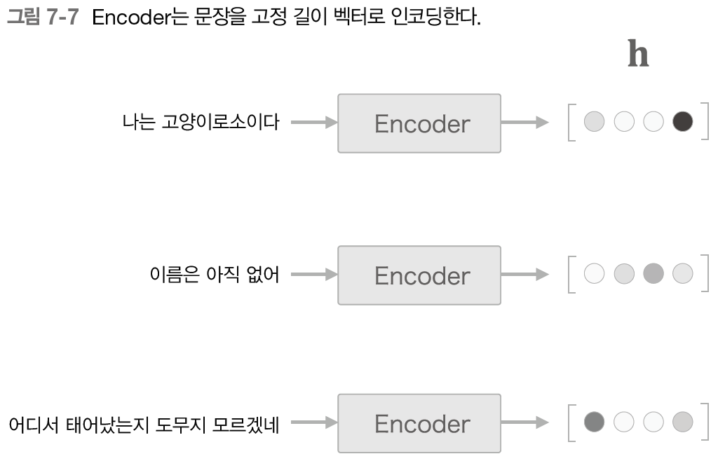 그림 7-7과 같이 LSTM의 은닉 상태 h는 고정 길이 벡터이기 때문에 인코딩한다는 것은 결국 임의 길이의 문장을 고정 길이 벡터로 변환하는 작업이다.