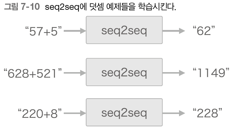 seq2seq가 덧셈 문제를 푼다면, 덧셈의 '예(샘플)'로부터 사용되는 문자의 패턴을 학습한다.