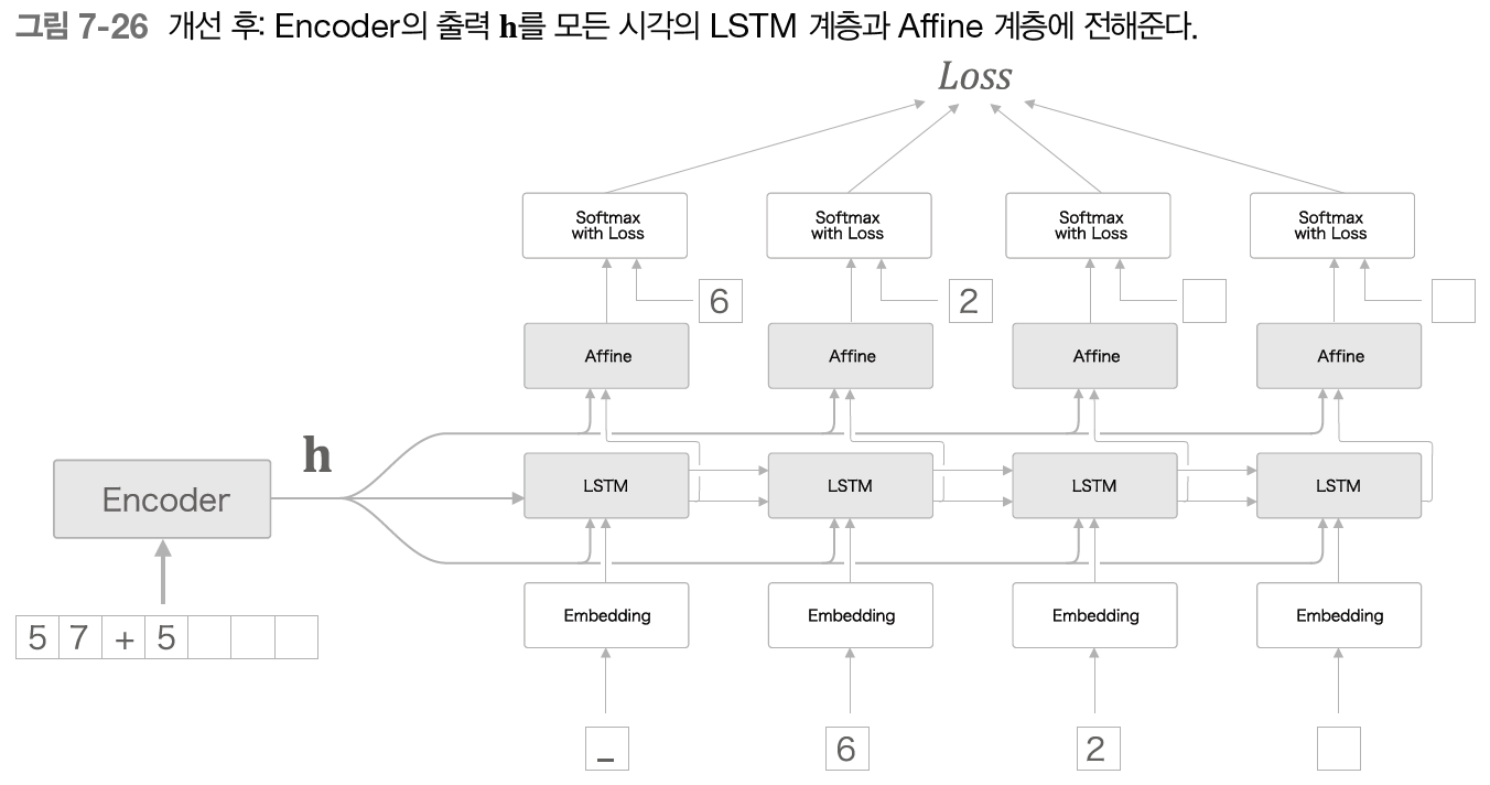그림 7-26과 같이 모든 시각의 Affine 계층과 LSTM 계층에 h를 전해준다.(집단지성)