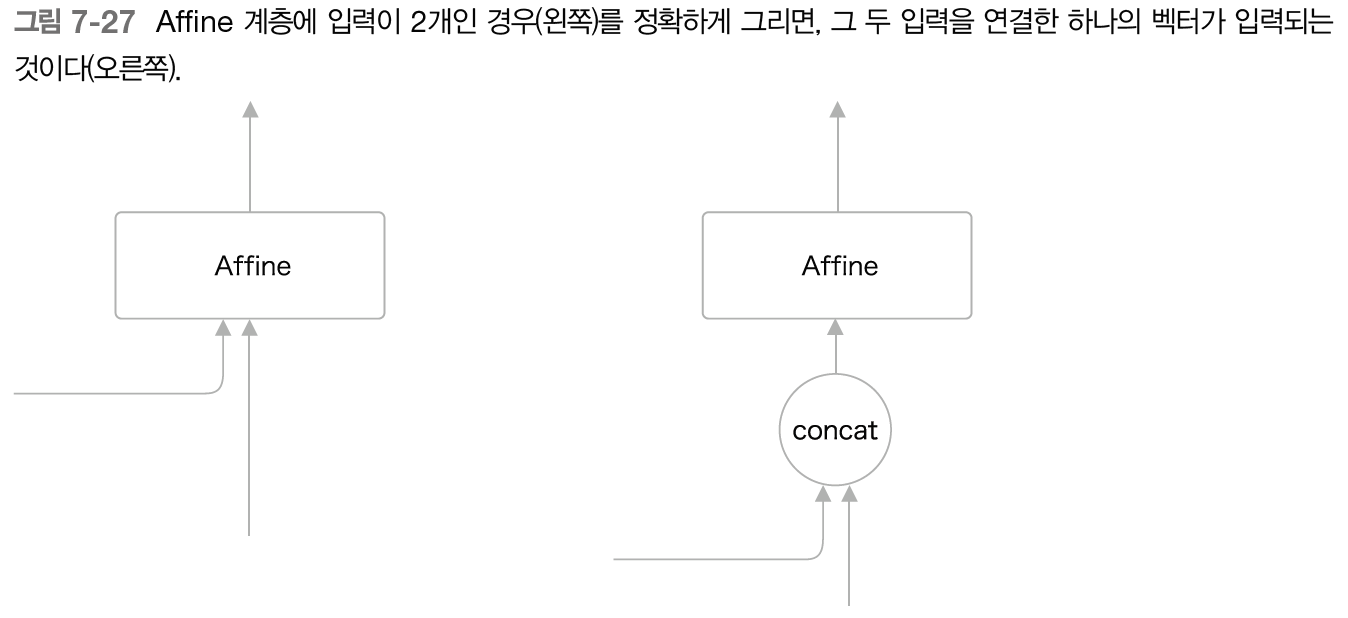 LSTM 계층과 Affine 계층에 입력되는 벡터가 2개씩이 되었는데, 이는 실제로 두 벡터가 연결(concatenate)된 것을 의미한다.