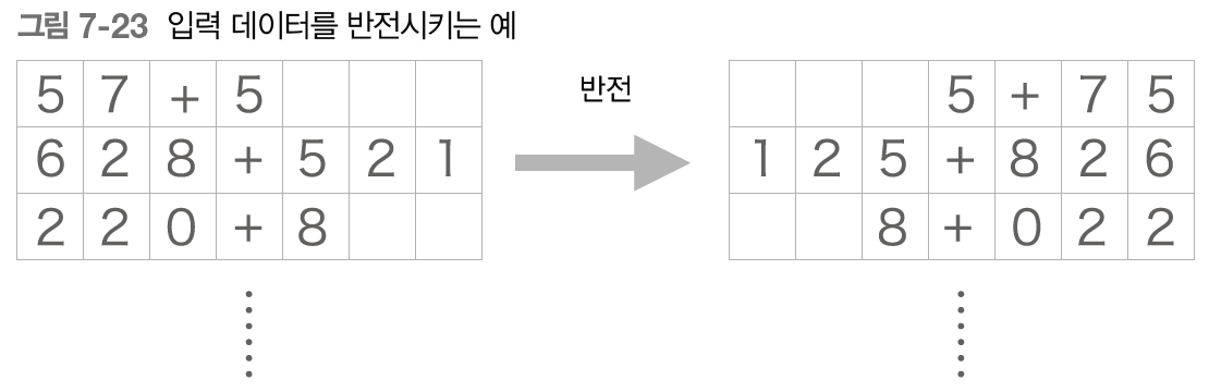 입력 데이터의 순서를 반전시키면 학습 진행이 빨라져서 최종 정확도도 좋아진다는 문헌이 있다.