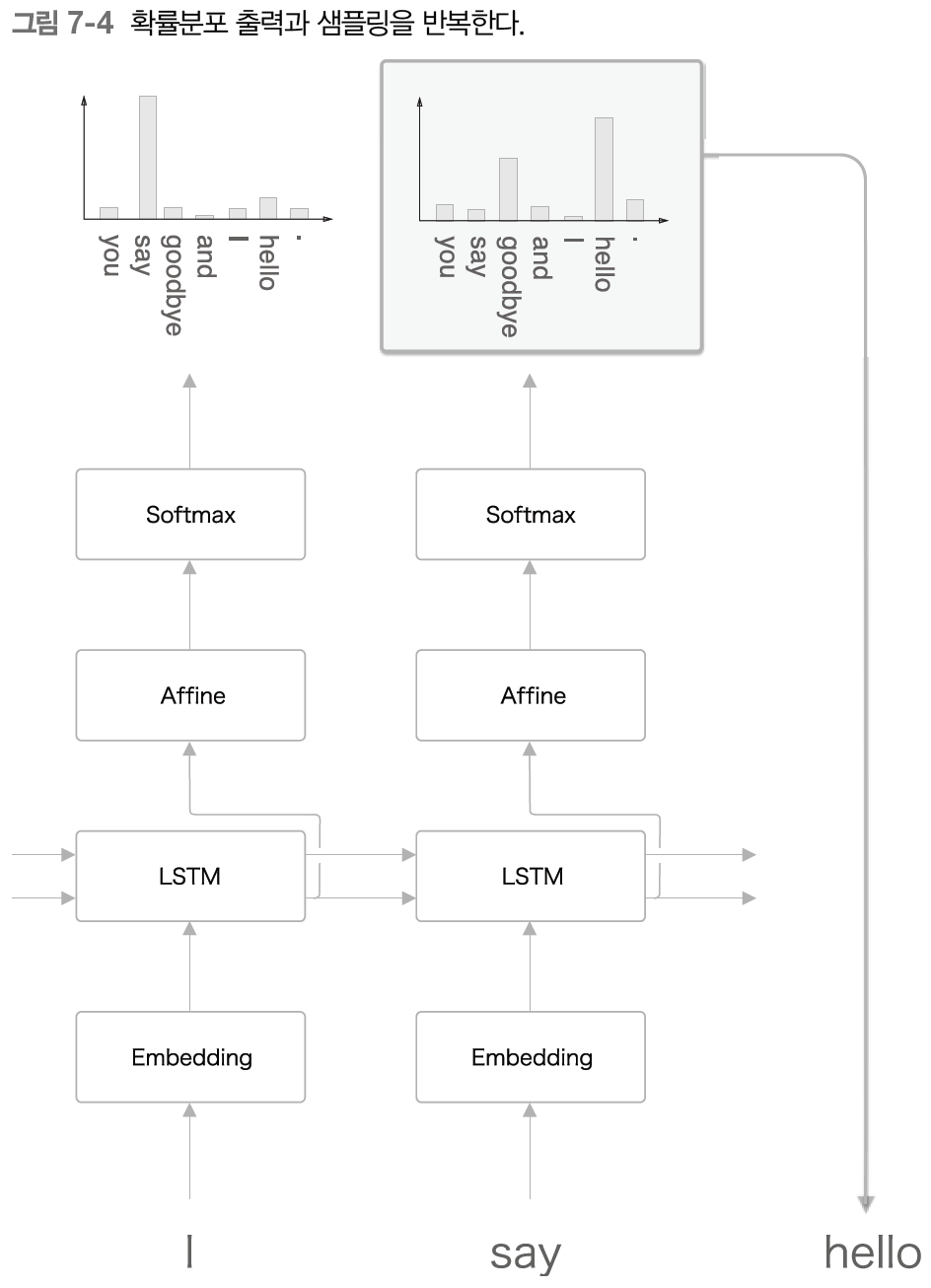 - 문장을 생성할 때는 하나의 단어(혹은 문자)를 주고 모델의 출력(확률분포)에서 샘플링하는 과정을 반복한다.