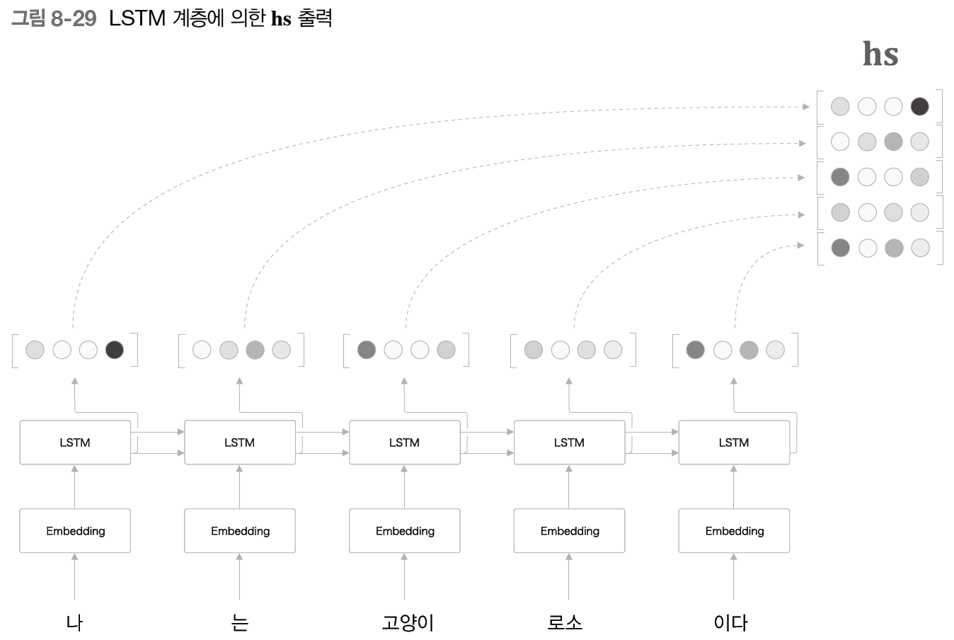 이를 위해 그림 8-2처럼 시각별 LSTM 계층의 은닉 상태 벡터를 모두 이용한다.