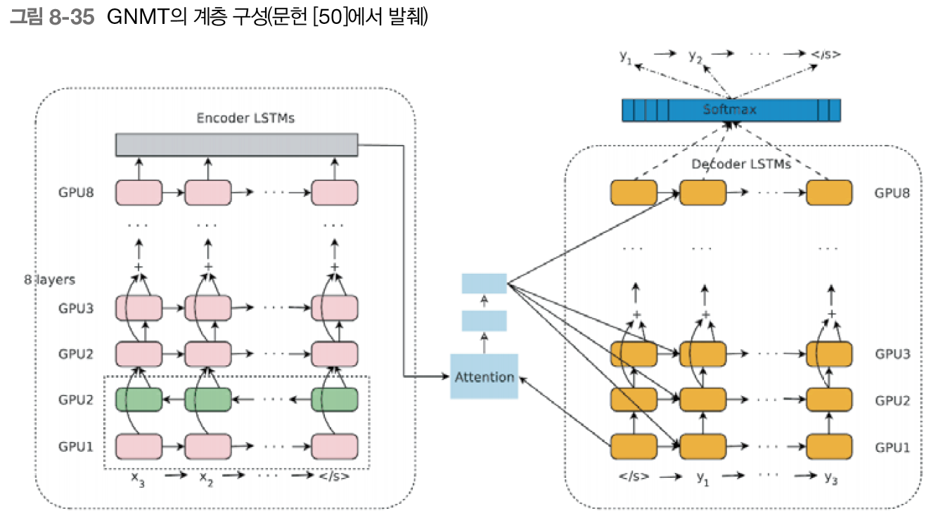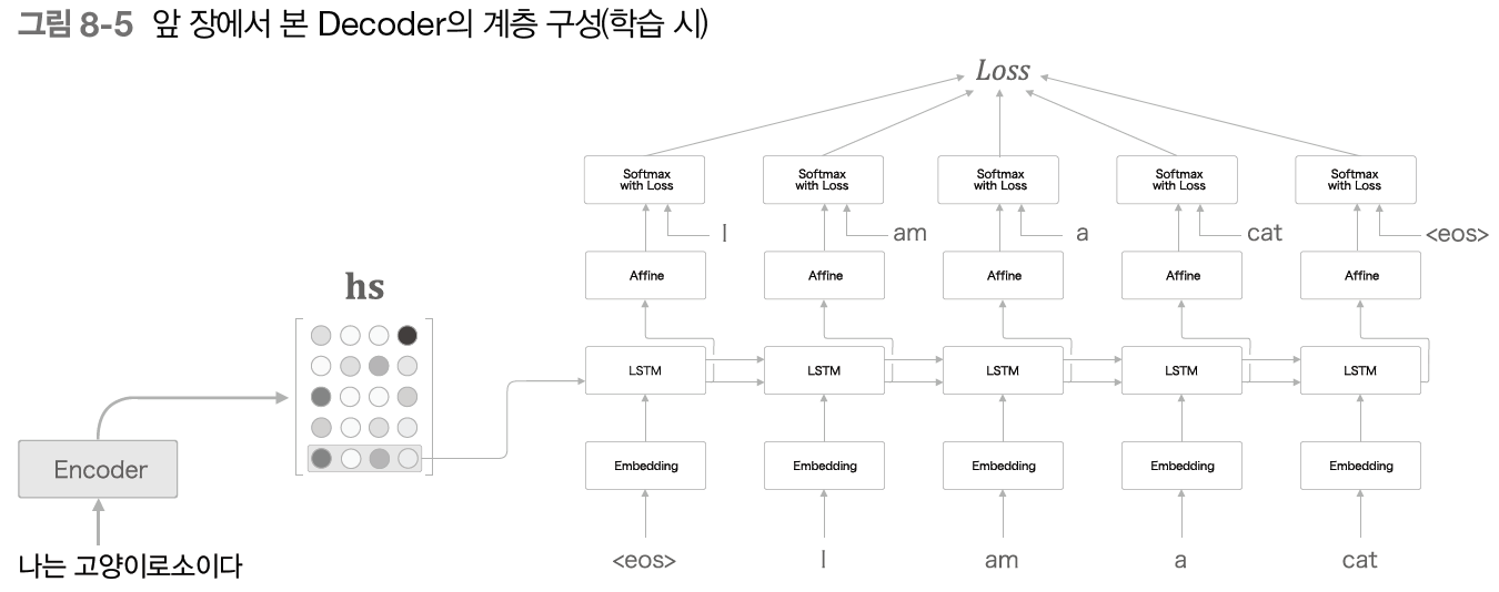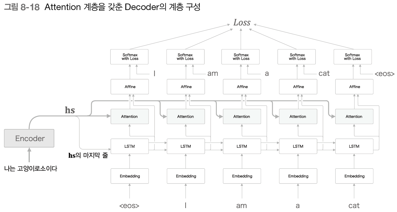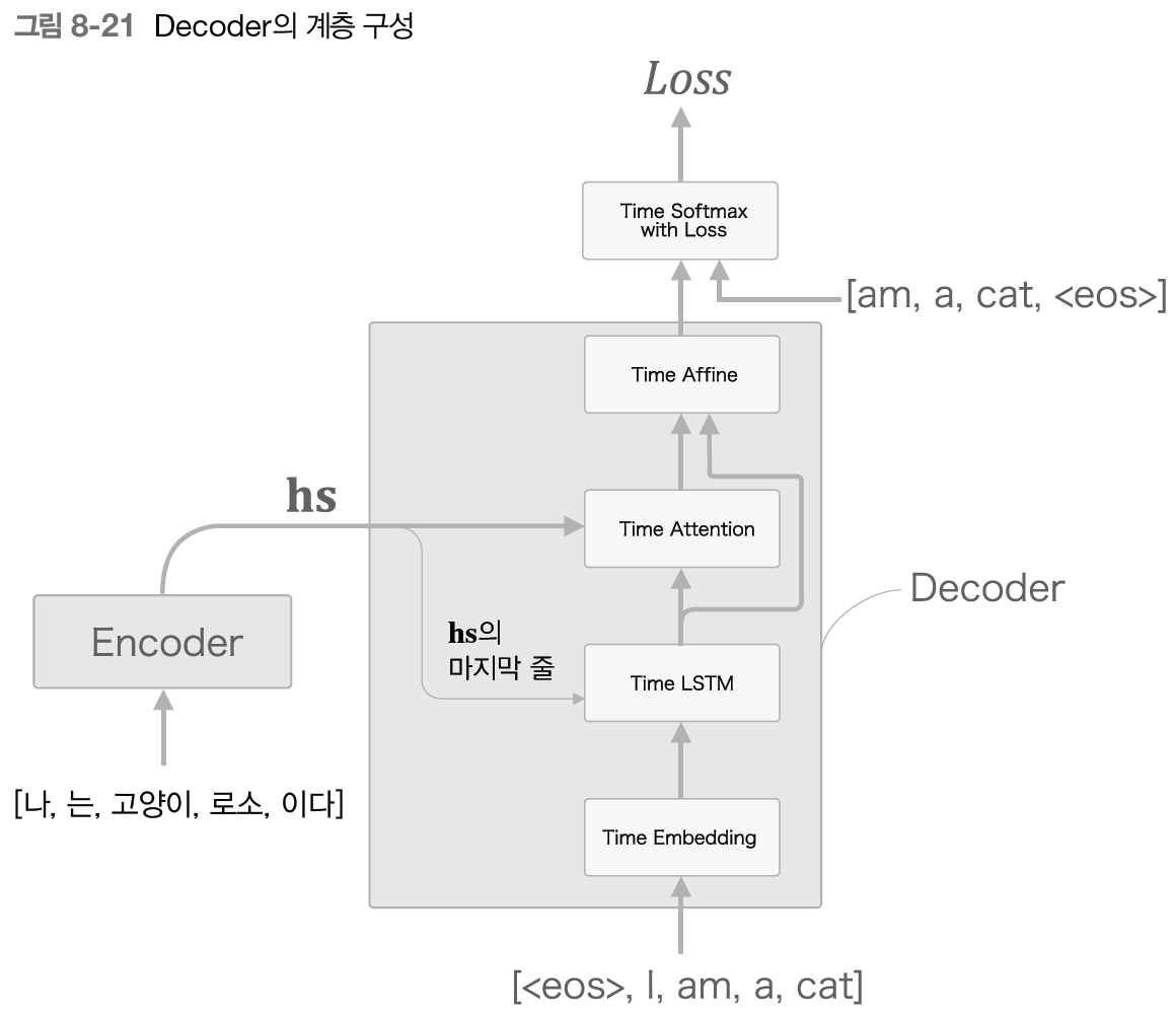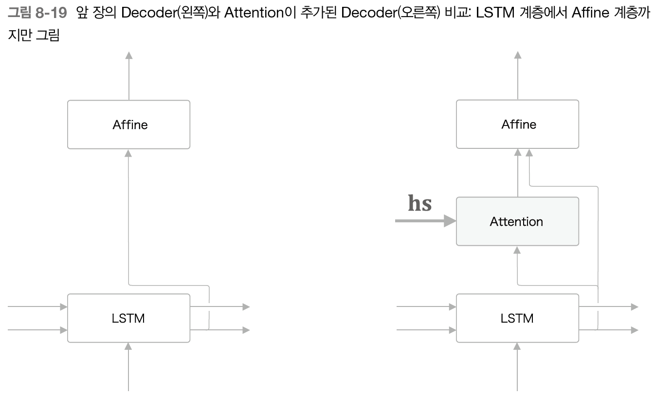 즉, 개선 전 Decoder에 Attention 계층의 맥락 벡터를 추가한 것이다.(그림 8-19)