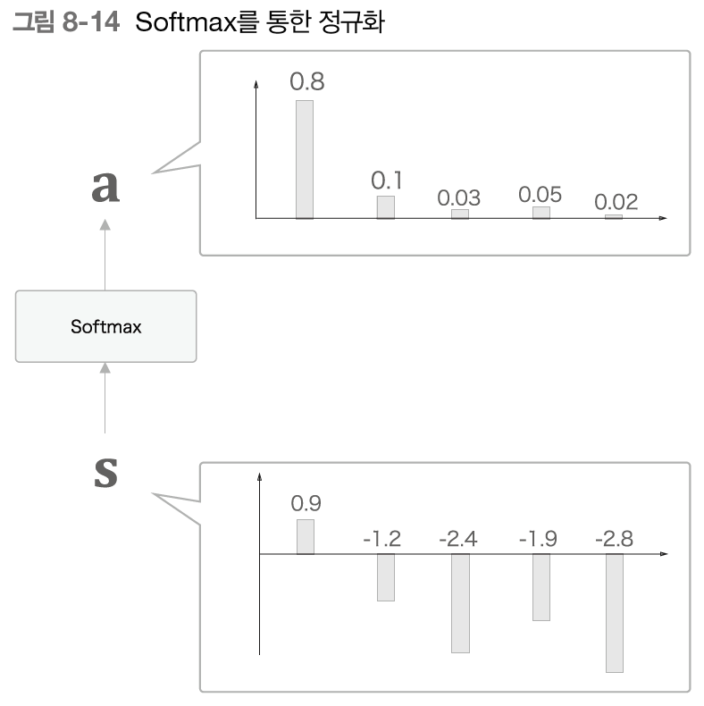 그 후 소프트맥스 함수를 이용해 정규화를 거쳐 가중치(확률)를 구한다.(그림 8-14)