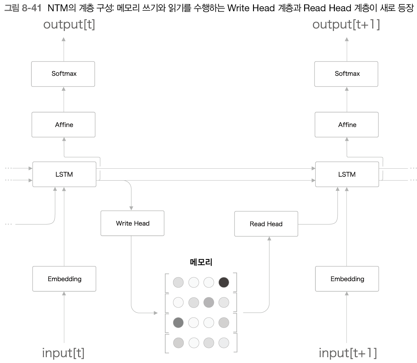 그리고 각 시각에서 LSTM 계층의 은닉 상태를 Write Head 계층이 받아서 필요한 정보를 메모리에 쓴다.