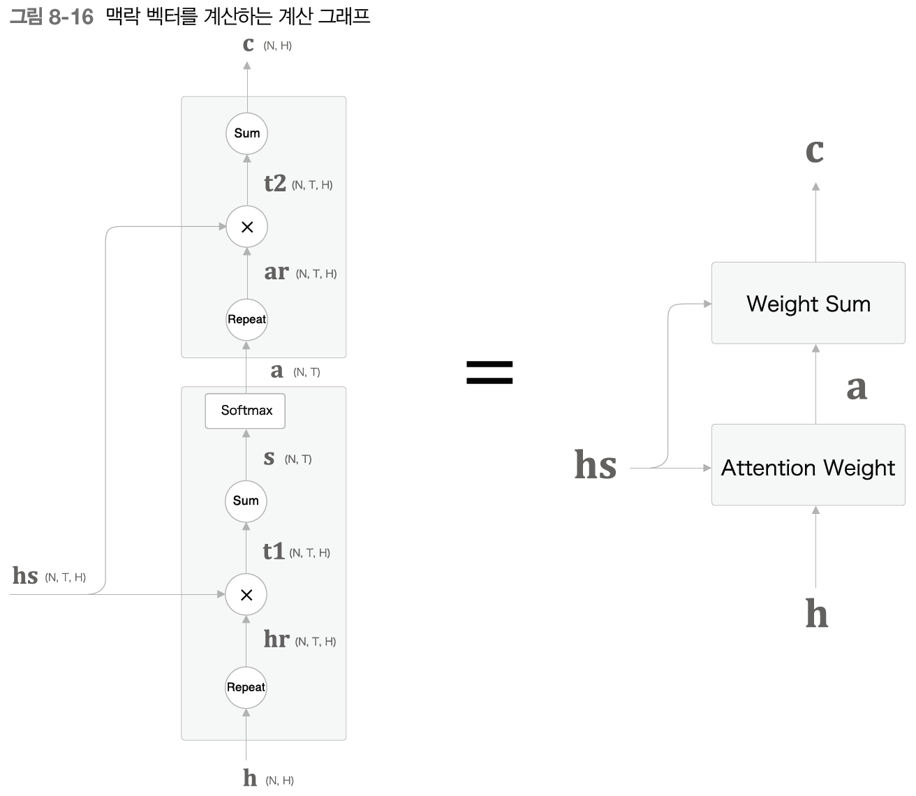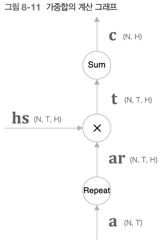 그 다음 Weight Sum 계층이 a와 hs의 가중합을 구하여 맥락 벡터 c로 출력한다.