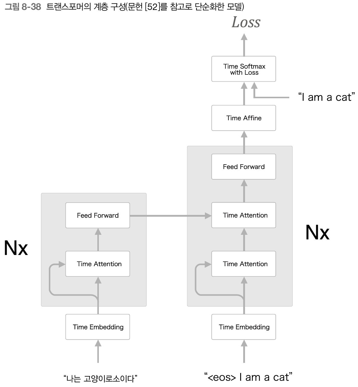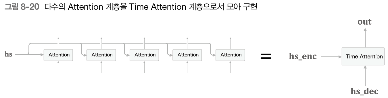 다수의 Attention 계층을 Time Attention 계층으로 모아 구현하면 그림 8-20과 같다.