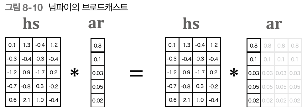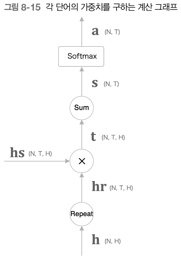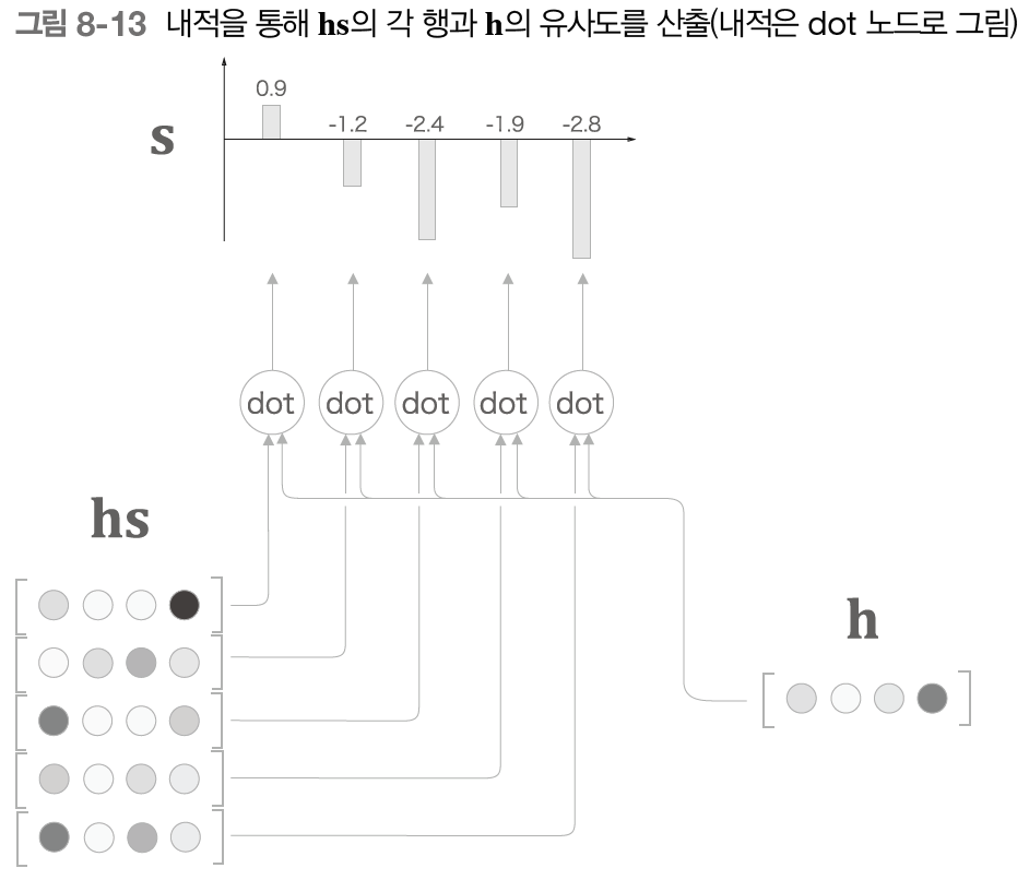 그림 8-13처럼 내적을 이용해 hs와 h의 각 단어 벡터와의 유사도(점수)를 구한다.