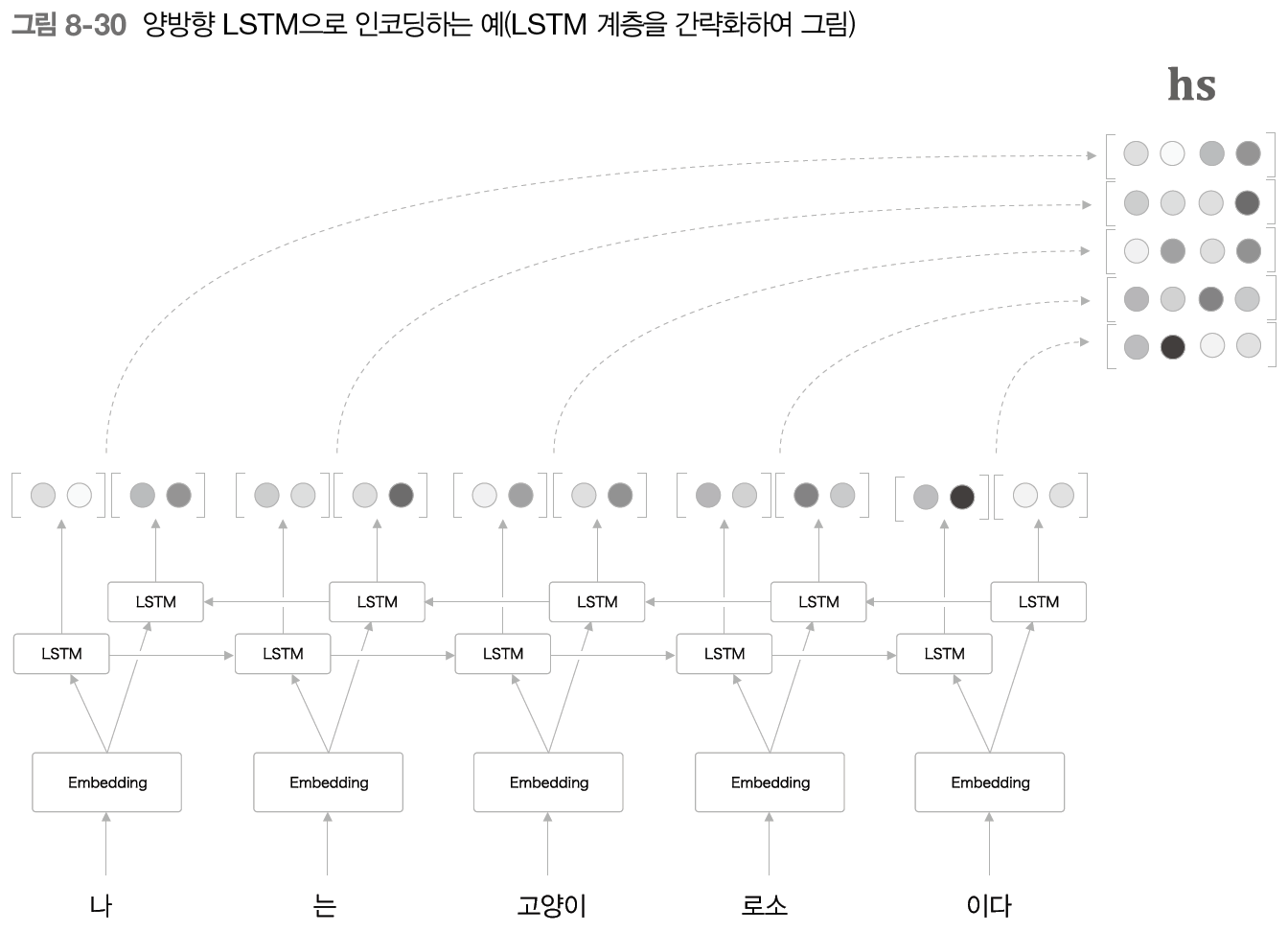 구현할 때는 입력 문장을 '왼쪽부터 오른쪽으로' 처리하는 일반적인 LSTM 계층과 입력문장의 단어들을 반대순서로 나열하는 또 하나의 LSTM 계층을 사용하면 된다.
