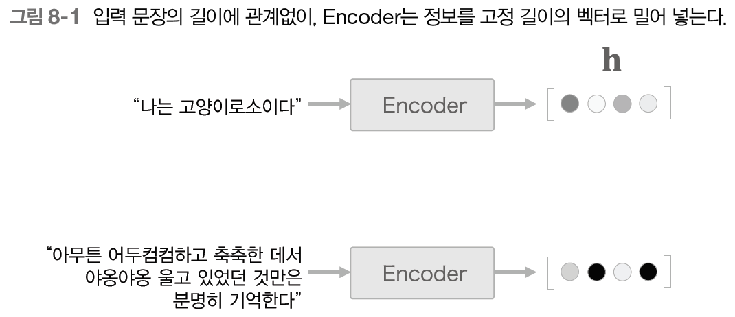 고정길이벡터는 입력 문장의 길이에 관계없이(아무리 길어도) 항상 같은 길이의 벡터로 변환한다는 뜻이다.