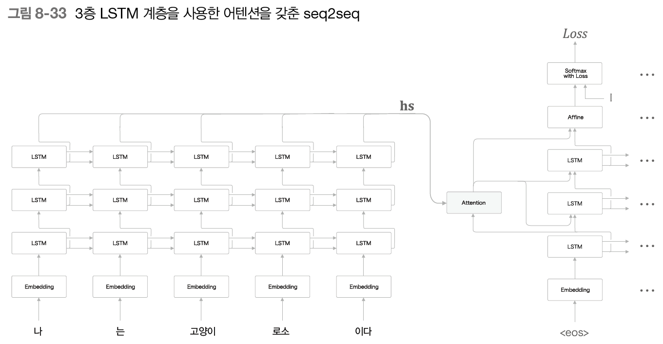 최종적으로 그림 8-6에서 '어떤 계산(LSTM계층과 Affine 계층 사이)'에 Attention 계층을 삽입하면 된다.