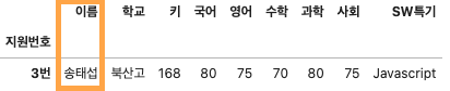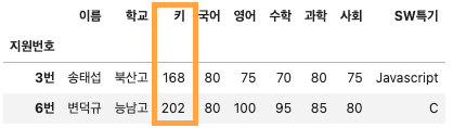 df.loc[df['키'] >= 185, ['이름', '수학', '과학']] # 키가 185 이상인 학생들의 이름, 수학, 과학 데이터