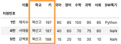 df.loc[(df['키'] >= 185) & (df['학교'] == '북산고')] # 키가 185 이상인 북산고 학생 데이터
