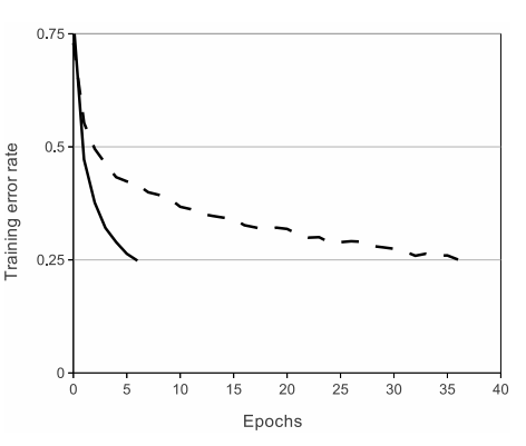 입력 x의 Neuron 출력 f를 모델링하는 표준적인 방법은 f(x) = tanh(x) or f(x) = (1 + e^ −x )^ −1 이다. gradient descent를 이용한 학습시간 관점에서 saturating 비선형은 non-saturating 비선형(f(x) = max(0, x))보다 느리다. Nair와 Hinton에 따라 ReLUs라는 비선형방법을 가지고 뉴런들을 참조했다. ReLUs를 이용한 Deep CNNs는 tanh보다 빠르다. CIFAR-10 dataset for a particular four-layer convolutional network에서 25% 학습에러를 위해 필요로 하는 반복횟수를 Figure 1 에서 볼 수 있다. 고전적인 saturating 뉴런모델로는 이러한 큰 신경망 실험을 할 수 없다는 것을 보여준다.
