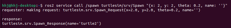 ros2 service call /spawn turtlesim/srv/Spawn "{x: 2, y: 2, theta: 0.2, name: ''}"