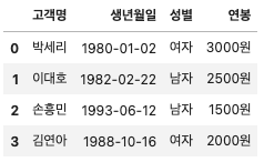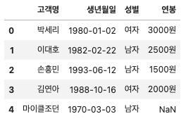 '연봉': ['2000원', '3000원', '1500원', '2500원', '3500원']})