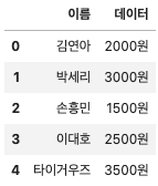 '데이터': ['2000원', '3000원', '1500원', '2500원', '3500원']})